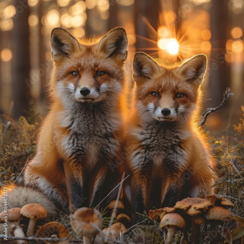 © Miramiska, Obraz premium Two charming red foxes peacefully sit amidst a lush forest setting. The animals appear relaxed and curious, creating a serene and natural scene. Perfect for nature, wildlife, or animal photography.