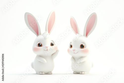 Fototapeta premium Two charming white rabbits standing side by side on white surface