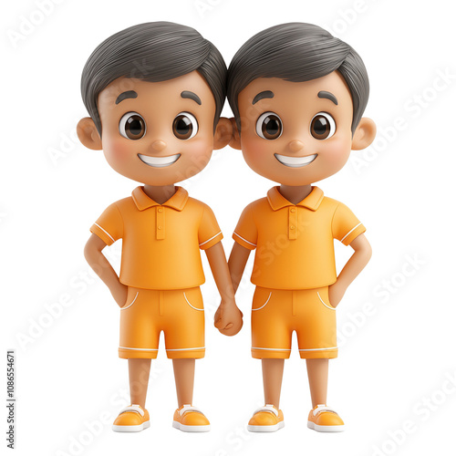 © Puckung, Naklejka premium Two cheerful cartoon boys in matching orange outfits, holding hands and smiling. Perfect for children's themes and friendship.3d render object isolated on white background