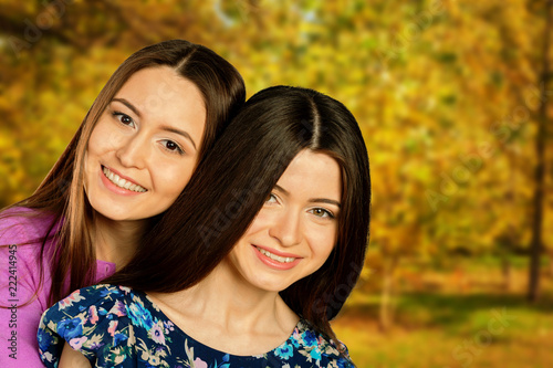 Obraz premium Two cheerful girls twins, in the street autumn park
