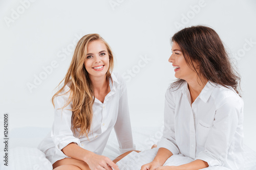 Obraz premium Two cheerful laughing girls in white shirts on bed