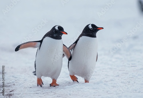 © rafka, Naklejka premium Two cheerful penguins waddle through a snowy landscape, appearing to hold flippers