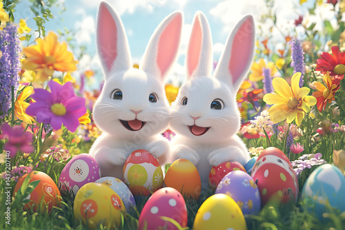 Obraz premium Two cheerful rabbits surrounded by colorful Easter eggs in a vibrant flower...