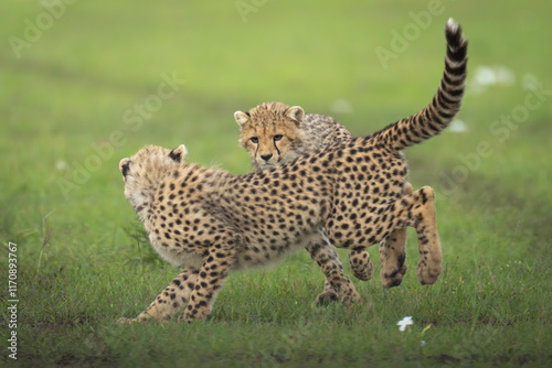 Fototapeta premium Two cheetah cubs playing on short grass