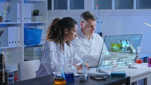 © Synthex, Obraz premium Two chemists studying chemical reaction simulation on holographic screen in modern lab