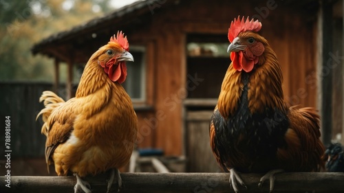 Fototapeta premium Two chickens are standing on a wooden fence near the house. Generative AI.