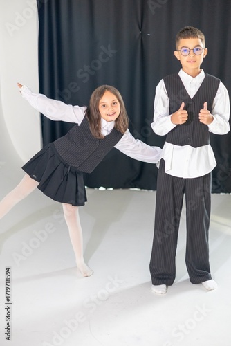 © Nastya Berry, Fototapeta premium Two children, a girl and a boy, pose playfully in coordinated formal outfits with playful expressions against a simple backdrop.