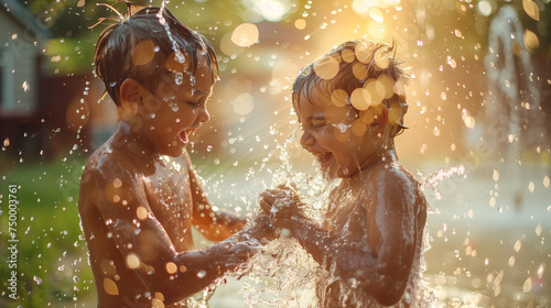 © NaphakStudio, Obraz premium Two children are captured in a burst of laughter as they play with water in the golden light of a summer afternoon.