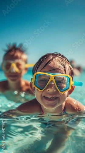 Fototapeta premium Two children are in the water wearing yellow goggles