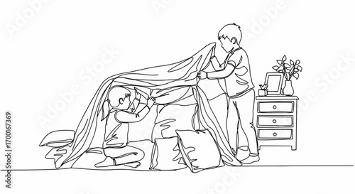 © root.dsgn, Obraz premium Two children build a fort using blankets and pillows.