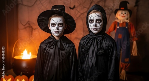 Naklejka premium Two children dressed in halloween costumes with spooky makeup pose in front of a festive backdrop