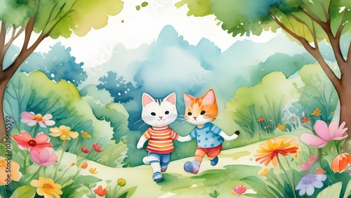 Fototapeta premium Two children running happily in a vibrant park, surrounded by blooming flowers and trees, captured in watercolor hues.
