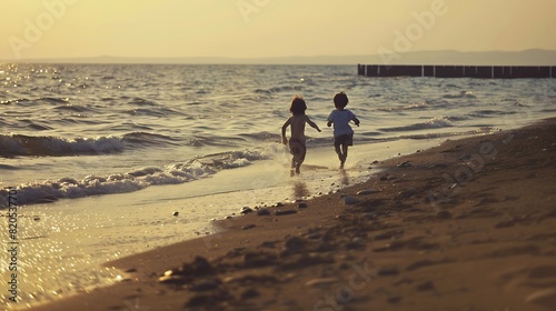 © The Little Hut, Naklejka premium Two children running toward the water at a beach at dusk : Generative AI