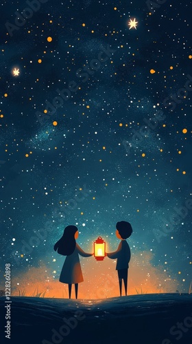Obraz premium Two Children Sharing Lantern Light Under Starry Night