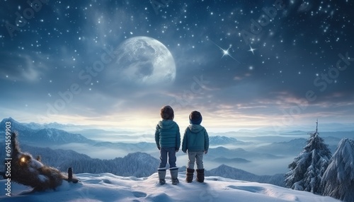 Obraz premium two children standing in the snow watching the moon from the cliff