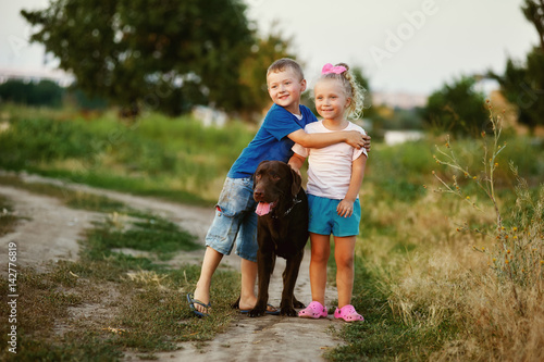 Fototapeta premium Two children walking with a dog breed Labrador