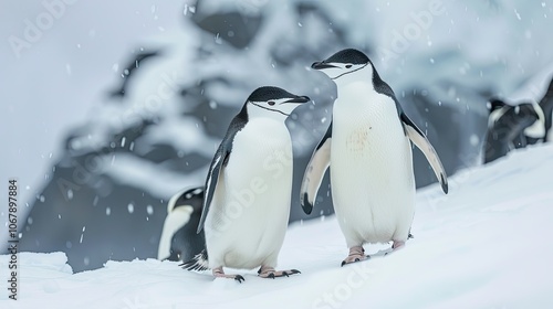 © Ariep, Fototapeta premium Two Chinstrap Penguins Stand in Snowy Landscape