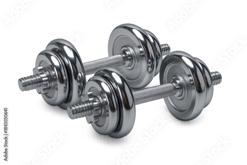 © PNG Kingdom , Fototapeta premium Two chrome dumbbells representing fitness, strength, and weightlifting for gym workouts and bodybuilding