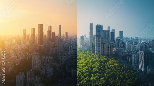 Fototapeta premium Two cities side by side, one is a city with tall buildings