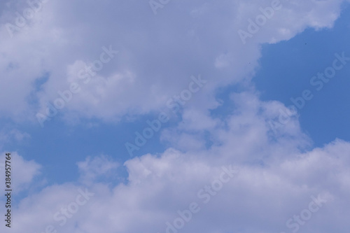Fototapeta premium Two cloud banks passing each other in a blue sky just about touching