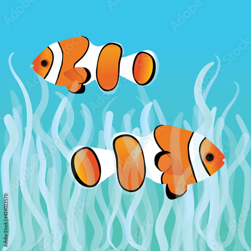 Fototapeta premium Two clownfishes swimming between sea anemones