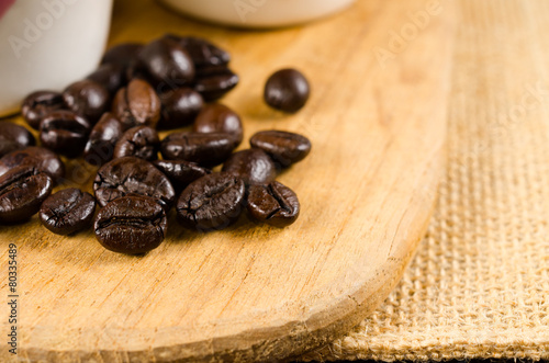 © bookzaa, Obraz premium Two coffee cup on wooden board and coffee bottle with back backg