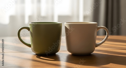© Madictory, Obraz premium Two coffee cups on a table in soft light, morning beverage, kitchen still life photo