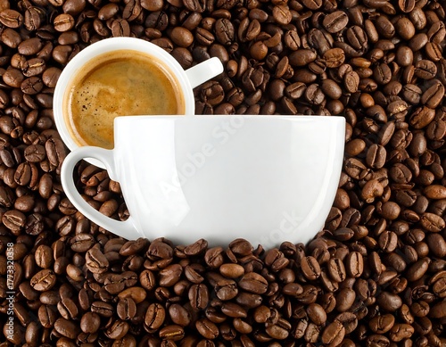 Fototapeta premium Two coffee cups surrounded by coffee beans