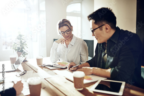 © Flamingo Images, Obraz premium Two colleagues comparing notes at a table in an office
