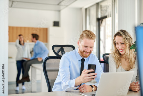 Obraz premium Two colleagues working in office, he is showing something to her on his smartphone