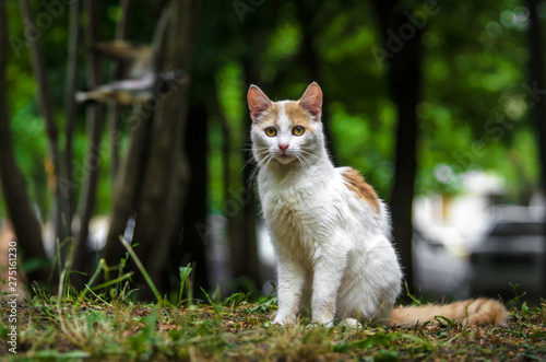 Fototapeta premium Two-colored cat in a green garden is turned back and washed