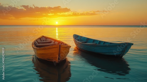 © nodabandel132, Fototapeta premium Two colorful boats at sunset on calm water