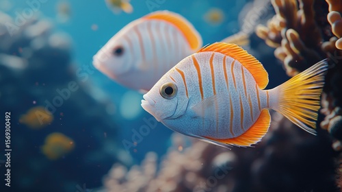 © rafani, Fototapeta premium Two colorful fish swim near a coral reef.