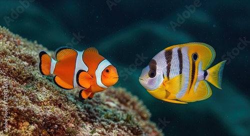 Fototapeta premium Two colorful fish swimming near coral reef in ocean water.