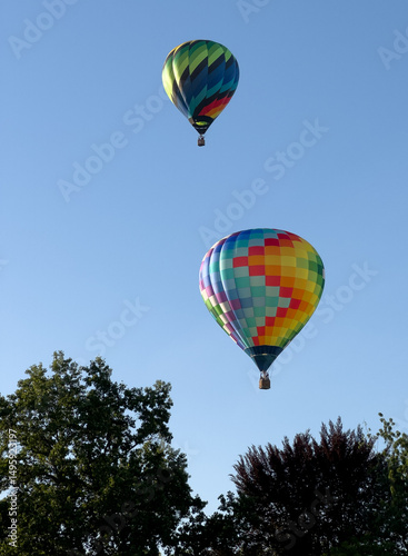 © Dawn, Fototapeta premium Two colorful hot air balloons lift off into the sky clearing the trees at a balloon stampede.