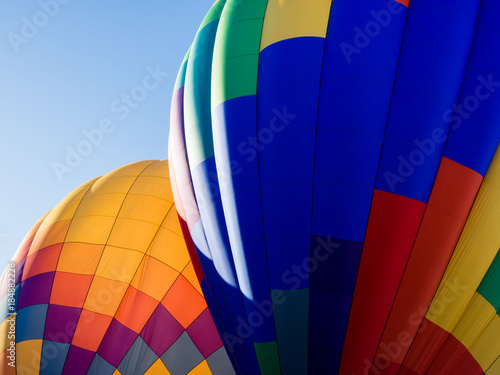 © amenohi, Fototapeta premium Two colorful hot air balloons on the ground inflating - at Winthrop Balloon Festival, Washington state