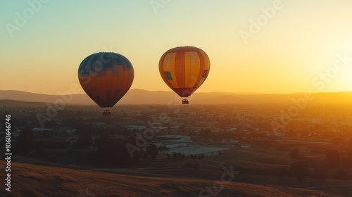 © Matthew, Naklejka premium Two colorful hot air balloons soaring above a scenic landscape at sunset.