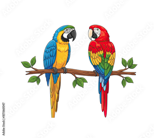 © Anasvectorpng, Fototapeta premium Two Colorful Macaw Parrots Perched on a Branch Against a Transparent Background