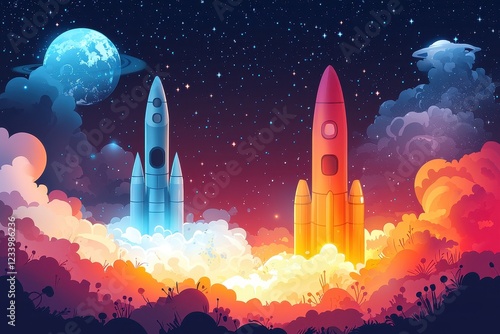 Fototapeta premium Two colorful rockets launch amidst a starry cosmic backdrop.