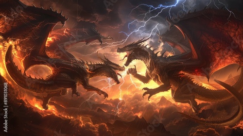 Fototapeta premium Two colossal dragons wreathed in elemental fury, battling amidst a storm of...