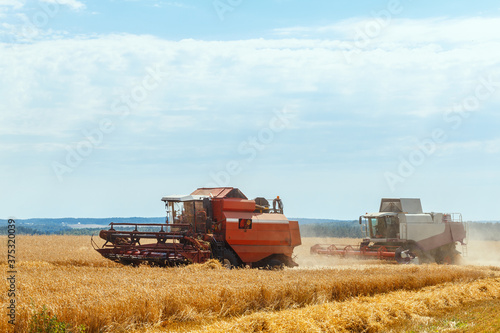 Fototapeta premium Two combines harvests ripe wheat in the grain field.