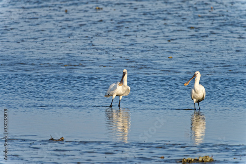 © Matthieu Tuffet, Fototapeta premium two common spoonbill Platalea leucorodia feeding on mudflat, Fukuoka, Japan