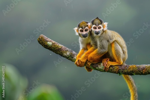 © darshika, Obraz premium Two common squirrel monkeys Saimiri sciureus playing on a tree branch