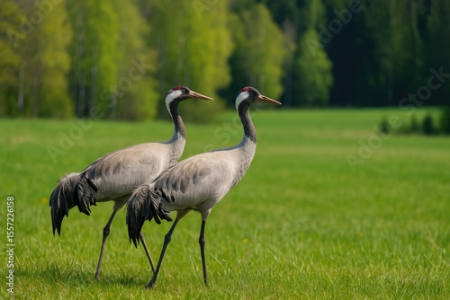 © TheWaterMeloonProjec, Obraz premium Two construction cranes in a grassy field