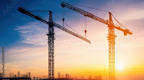 Fototapeta premium Two construction cranes silhouetted against a vibrant sunset sky,...
