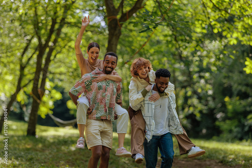 © bernardbodo, Obraz premium Two couples having a piggyback race in a park