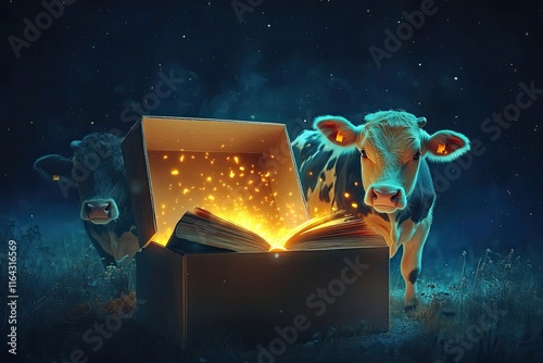 © Ariestia, Fototapeta premium Two Cows Observe A Magical Glowing Book In A Box