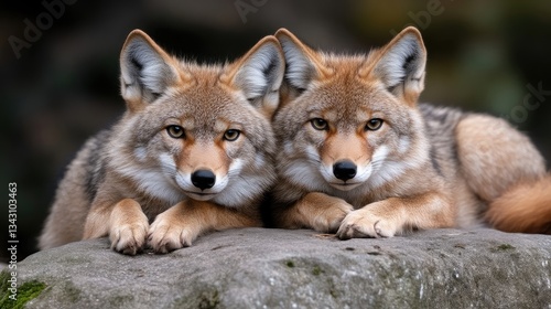 Obraz premium Two Coyotes Resting on a Rock