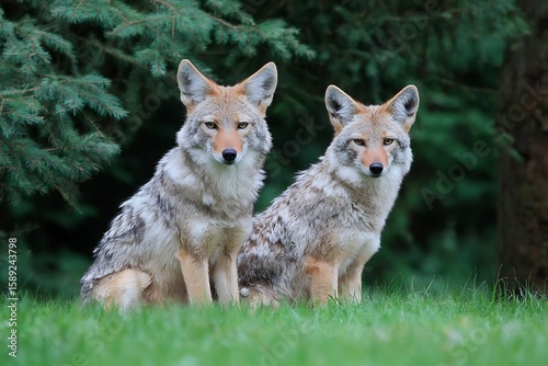 © AL, Naklejka premium Two Coyotes Sitting Calmly on the Grass Underneath Evergreen Trees looking at camera