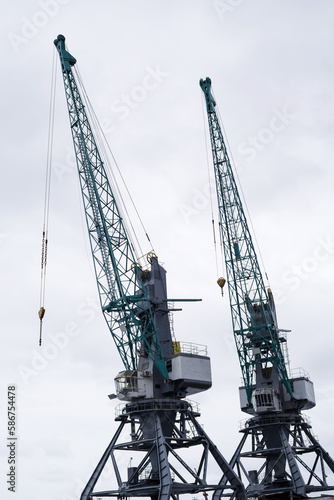 © isavira, Fototapeta premium Two cranes in a seaport against a cloudy sky